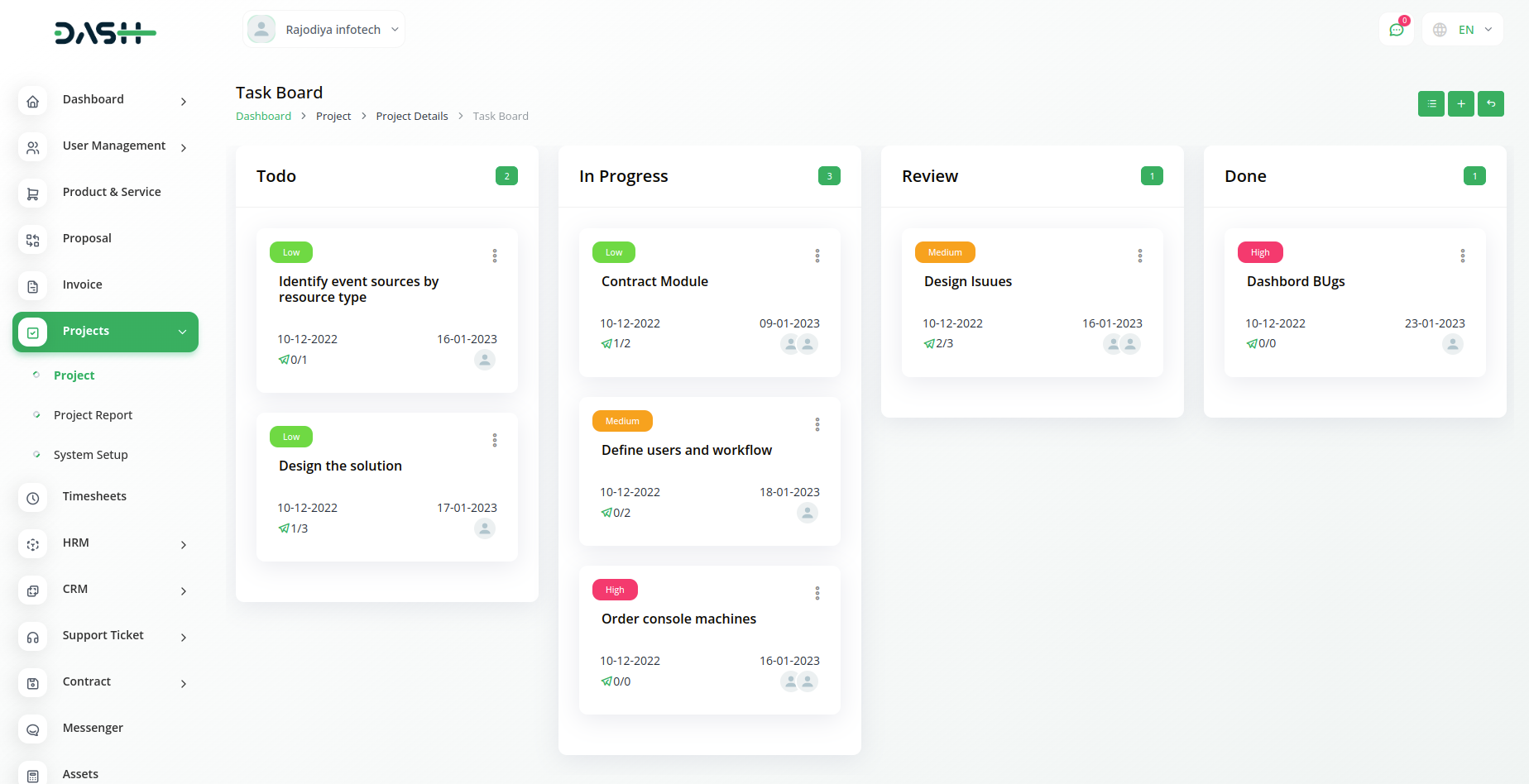 Create new bugs and assign users and priority to them. You can write a note in the text box for the bug description. Also, the status of each bug could be changed through an easy drop-down and Kanban drag system.